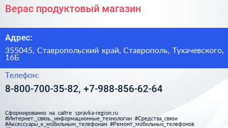 Верас, продуктовый магазин по адресу 355045, Ставропольский край, Ставрополь, Тухачевского, 16Б в дальнейшем Организация, размещена в следующих категориях: