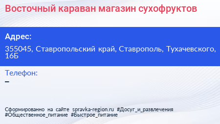 Восточный караван, магазин сухофруктов по адресу 355045, Ставропольский край, Ставрополь, Тухачевского, 16Б в дальнейшем Организация, размещена в следующих категориях: