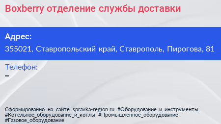 Boxberry, отделение службы доставки по адресу 355021, Ставропольский край, Ставрополь, Пирогова, 81 в дальнейшем Организация, размещена в следующих категориях: