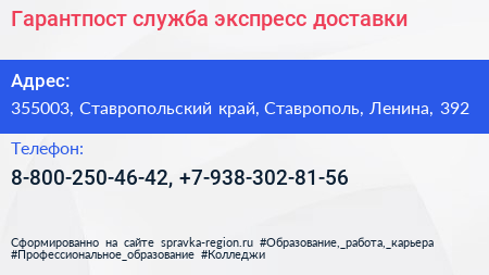 Гарантпост, служба экспресс-доставки по адресу 355003, Ставропольский край, Ставрополь, Ленина, 392 в дальнейшем Организация, размещена в следующих категориях: