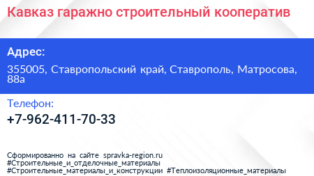 Кавказ, гаражно-строительный кооператив по адресу 355005, Ставропольский край, Ставрополь, Матросова, 88а в дальнейшем Организация, размещена в следующих категориях: