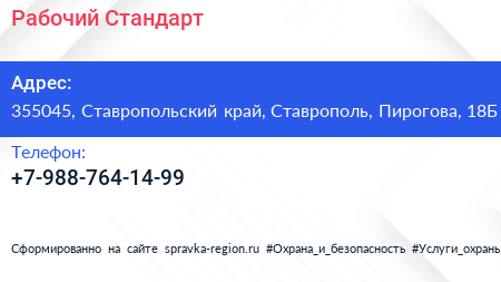 Рабочий Стандарт по адресу 355045, Ставропольский край, Ставрополь, Пирогова, 18Б в дальнейшем Организация, размещена в следующих категориях: