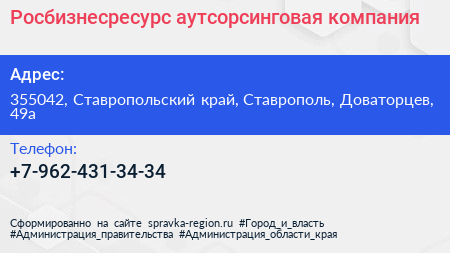Росбизнесресурс, аутсорсинговая компания по адресу 355042, Ставропольский край, Ставрополь, Доваторцев, 49а в дальнейшем Организация, размещена в следующих категориях: