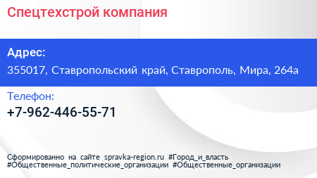 Спецтехстрой, компания по адресу 355017, Ставропольский край, Ставрополь, Мира, 264а в дальнейшем Организация, размещена в следующих категориях: