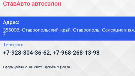 СтавАвто, автосалон по адресу 355008, Ставропольский край, Ставрополь, Селекционная, 7 в дальнейшем Организация, размещена в следующих категориях: