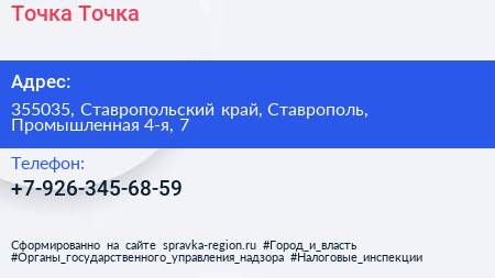 Точка-Точка по адресу 355035, Ставропольский край, Ставрополь, Промышленная 4-я, 7 в дальнейшем Организация, размещена в следующих категориях: