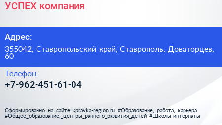 УСПЕХ, компания по адресу 355042, Ставропольский край, Ставрополь, Доваторцев, 60 в дальнейшем Организация, размещена в следующих категориях: