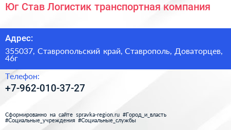 Юг Став Логистик, транспортная компания по адресу 355037, Ставропольский край, Ставрополь, Доваторцев, 46г в дальнейшем Организация, размещена в следующих категориях: