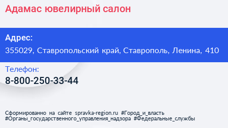 Адамас, ювелирный салон по адресу 355029, Ставропольский край, Ставрополь, Ленина, 410 в дальнейшем Организация, размещена в следующих категориях: