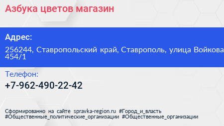 Азбука цветов, магазин по адресу 256244, Ставропольский край, Ставрополь, улица Войкова, 454/1 в дальнейшем Организация, размещена в следующих категориях: