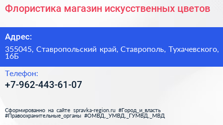 Флористика, магазин искусственных цветов по адресу 355045, Ставропольский край, Ставрополь, Тухачевского, 16Б в дальнейшем Организация, размещена в следующих категориях: