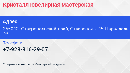 Кристалл, ювелирная мастерская по адресу 355042, Ставропольский край, Ставрополь, 45 Параллель, 7а в дальнейшем Организация, размещена в следующих категориях: