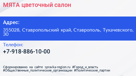 МЯТА, цветочный салон по адресу 355028, Ставропольский край, Ставрополь, Тухачевского, 30 в дальнейшем Организация, размещена в следующих категориях: