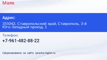 Маяк по адресу 355042, Ставропольский край, Ставрополь, 3-й Юго-Западный проезд, 1 в дальнейшем Организация, размещена в следующих категориях: