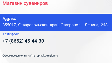 Магазин сувениров по адресу 355017, Ставропольский край, Ставрополь, Ленина, 243 в дальнейшем Организация, размещена в следующих категориях: