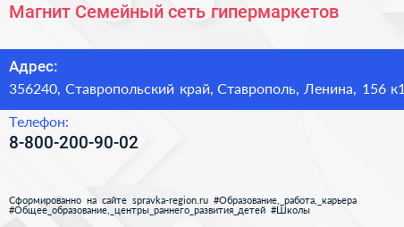 Магнит Семейный, сеть гипермаркетов по адресу 356240, Ставропольский край, Ставрополь, Ленина, 156 к1 в дальнейшем Организация, размещена в следующих категориях: