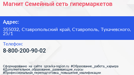 Магнит Семейный, сеть гипермаркетов по адресу 355032, Ставропольский край, Ставрополь, Тухачевского, 25/1 в дальнейшем Организация, размещена в следующих категориях: