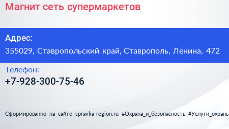 Магнит, сеть супермаркетов по адресу 355029, Ставропольский край, Ставрополь, Ленина, 472 в дальнейшем Организация, размещена в следующих категориях:
