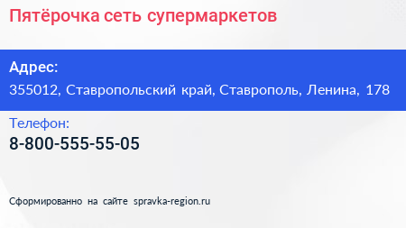 Пятёрочка, сеть супермаркетов по адресу 355012, Ставропольский край, Ставрополь, Ленина, 178 в дальнейшем Организация, размещена в следующих категориях: