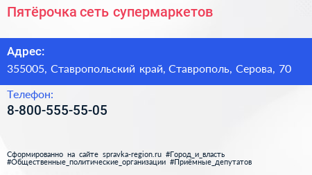 Пятёрочка, сеть супермаркетов по адресу 355005, Ставропольский край, Ставрополь, Серова, 70 в дальнейшем Организация, размещена в следующих категориях: