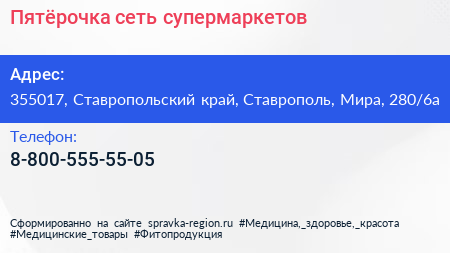 Пятёрочка, сеть супермаркетов по адресу 355017, Ставропольский край, Ставрополь, Мира, 280/6а в дальнейшем Организация, размещена в следующих категориях: