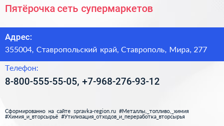 Пятёрочка, сеть супермаркетов по адресу 355004, Ставропольский край, Ставрополь, Мира, 277 в дальнейшем Организация, размещена в следующих категориях: