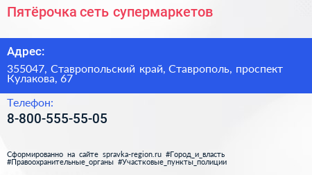 Пятёрочка, сеть супермаркетов по адресу 355047, Ставропольский край, Ставрополь, проспект Кулакова, 67 в дальнейшем Организация, размещена в следующих категориях: