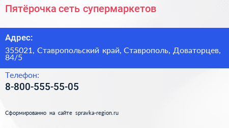 Пятёрочка, сеть супермаркетов по адресу 355021, Ставропольский край, Ставрополь, Доваторцев, 84/5 в дальнейшем Организация, размещена в следующих категориях: