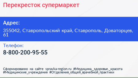 Перекресток, супермаркет по адресу 355042, Ставропольский край, Ставрополь, Доваторцев, 61 в дальнейшем Организация, размещена в следующих категориях: