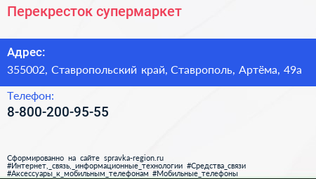 Перекресток, супермаркет по адресу 355002, Ставропольский край, Ставрополь, Артёма, 49а в дальнейшем Организация, размещена в следующих категориях: