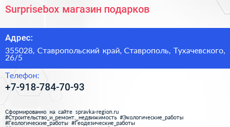 Surprisebox, магазин подарков по адресу 355028, Ставропольский край, Ставрополь, Тухачевского, 26/5 в дальнейшем Организация, размещена в следующих категориях: