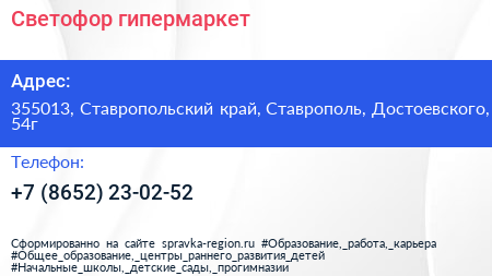 Светофор, гипермаркет по адресу 355013, Ставропольский край, Ставрополь, Достоевского, 54г в дальнейшем Организация, размещена в следующих категориях: