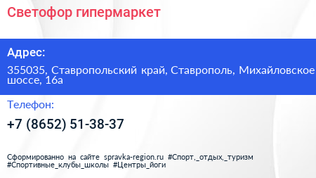 Светофор, гипермаркет по адресу 355035, Ставропольский край, Ставрополь, Михайловское шоссе, 16а в дальнейшем Организация, размещена в следующих категориях: