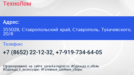 ТехноЛом по адресу 355028, Ставропольский край, Ставрополь, Тухачевского, 20/8 в дальнейшем Организация, размещена в следующих категориях: