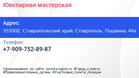 Ювелирная мастерская по адресу 355002, Ставропольский край, Ставрополь, Пушкина, 44а в дальнейшем Организация, размещена в следующих категориях: