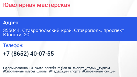 Ювелирная мастерская по адресу 355044, Ставропольский край, Ставрополь, проспект Юности, 20 в дальнейшем Организация, размещена в следующих категориях: