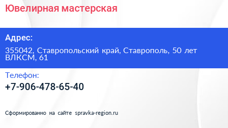 Ювелирная мастерская по адресу 355042, Ставропольский край, Ставрополь, 50 лет ВЛКСМ, 61 в дальнейшем Организация, размещена в следующих категориях:
