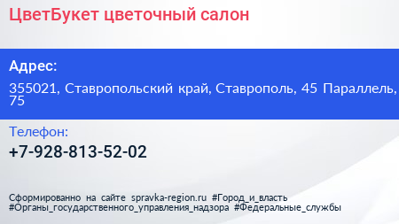 ЦветБукет, цветочный салон по адресу 355021, Ставропольский край, Ставрополь, 45 Параллель, 75 в дальнейшем Организация, размещена в следующих категориях: