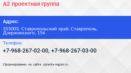А2, проектная группа по адресу 355003, Ставропольский край, Ставрополь, Дзержинского, 156 в дальнейшем Организация, размещена в следующих категориях: