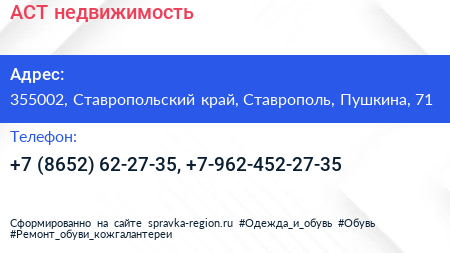 АСТ-недвижимость по адресу 355002, Ставропольский край, Ставрополь, Пушкина, 71 в дальнейшем Организация, размещена в следующих категориях: