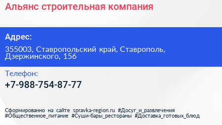 Альянс, строительная компания по адресу 355003, Ставропольский край, Ставрополь, Дзержинского, 156 в дальнейшем Организация, размещена в следующих категориях: