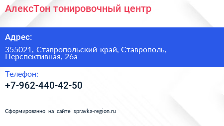 АлексТон, тонировочный центр по адресу 355021, Ставропольский край, Ставрополь, Перспективная, 26а в дальнейшем Организация, размещена в следующих категориях: