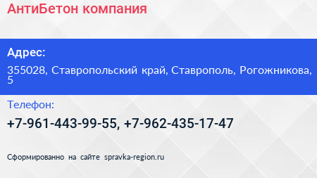 АнтиБетон, компания по адресу 355028, Ставропольский край, Ставрополь, Рогожникова, 5 в дальнейшем Организация, размещена в следующих категориях: