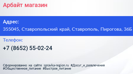 Арбайт, магазин по адресу 355045, Ставропольский край, Ставрополь, Пирогова, 36Б в дальнейшем Организация, размещена в следующих категориях: