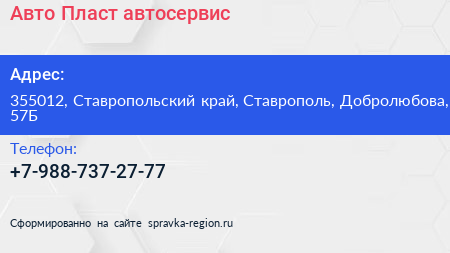 Авто-Пласт, автосервис по адресу 355012, Ставропольский край, Ставрополь, Добролюбова, 57Б в дальнейшем Организация, размещена в следующих категориях: