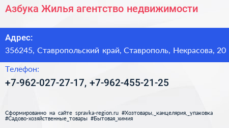 Азбука Жилья, агентство недвижимости по адресу 356245, Ставропольский край, Ставрополь, Некрасова, 20 в дальнейшем Организация, размещена в следующих категориях: