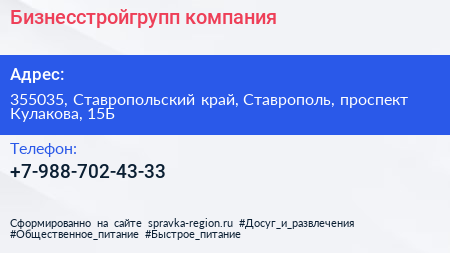 Бизнесстройгрупп, компания по адресу 355035, Ставропольский край, Ставрополь, проспект Кулакова, 15Б в дальнейшем Организация, размещена в следующих категориях: