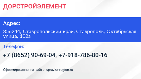 ДОРСТРОЙЭЛЕМЕНТ по адресу 356244, Ставропольский край, Ставрополь, Октябрьская улица, 102а в дальнейшем Организация, размещена в следующих категориях: