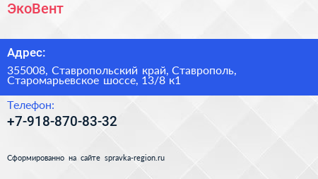 ЭкоВент по адресу 355008, Ставропольский край, Ставрополь, Старомарьевское шоссе, 13/8 к1 в дальнейшем Организация, размещена в следующих категориях: