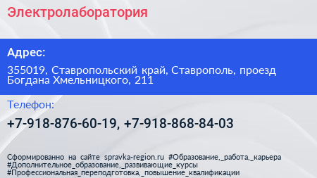 Электролаборатория по адресу 355019, Ставропольский край, Ставрополь, проезд Богдана Хмельницкого, 211 в дальнейшем Организация, размещена в следующих категориях: